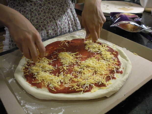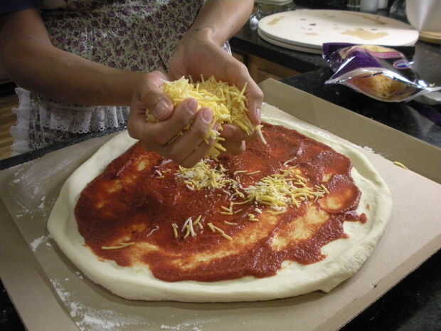 Coge un puñado grande de queso y luego separar en sus dos manos. Espolvoree el queso uniformemente a partir alrededor del borde y su forma de trabajo en el centro. Rellenar calvas con queso pero no hacerlo más, no hemos terminado todavía!