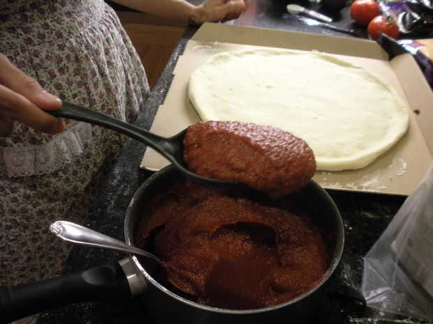 Cuchara un cucharón lleno de salsa en el centro de la pizza. Luego con el dorso de la cuchara, difundir la salsa en una espiral (ver imagen). Asegúrese de que la salsa va hasta el borde sin tocar la corteza. No dude en añadir más salsa si es necesario.
