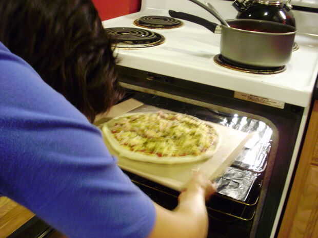 Cuando estés listo para poner la pizza en el horno, dar tu pizza una sacudida rápida para aflojarlo de la cáscara. Luego, deslícelo sobre la rejilla del horno (idealmente) con un movimiento suave y rápido, pero un par de sacudidas rápidas de trabajo bien también.