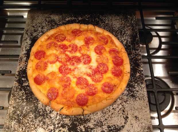 ingredientes1 cucharada de levadura secaUna pizca de sal140ml agua tibia180g de harina fuerte1 cucharada de aceite de oliva1 cucharada de albahaca secaRodajas de pepperoni1 lata de tomates picados2 cucharadas de puré de tomateQueso rallado Cheddar o