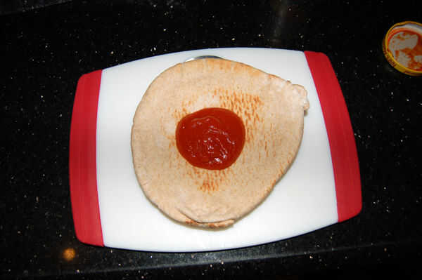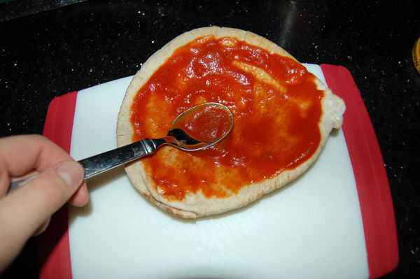 Establecer el Sr. Pita para que sus bordes están arriba (como un bol... te tipo de curvado) y darle un poco crema de sol, pero no demasiado. Demasiada salsa puede arruinar una pizza.