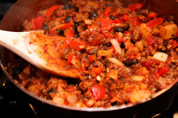 Brown 1 libra carne picada en una sartén grande. Añadir dados de 1/2 cebolla, 1/2 pimiento rojo picado, 1/4 taza de rodajas de aceitunas, 1/2 taza en cuadritos de piña, 3-4 dientes de ajo picado y 1 cucharada de orégano a la carne, así como el 80% de la salsa de espagueti. Cocinero hacia abajo hasta que la mezcla esté espesa, unos 10-15 minutos. Probar y rectificar la sazón según tu gusto.