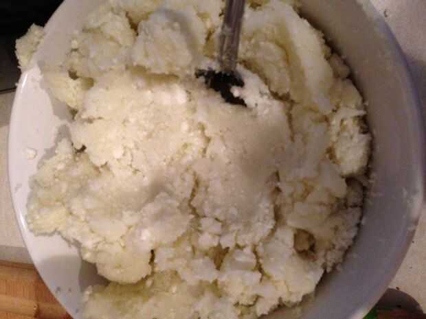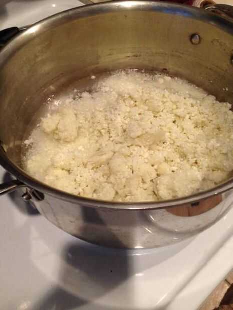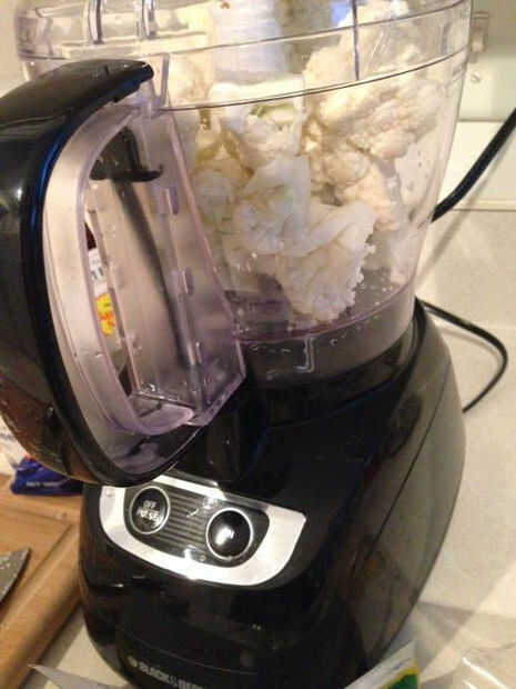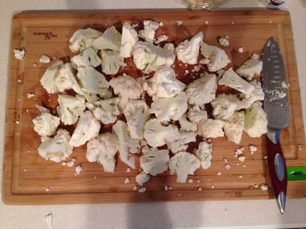 2. trocear la coliflor en pequeños trozos sobre una tabla de cortar
