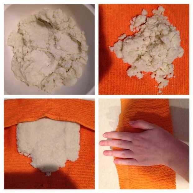 2. transferencia había preparado coliflor sobre un paño limpio y asegúrese de que usted exprime toda el agua hacia fuera. Trate de secarlo lo más posible. Puede tomar otra toalla.