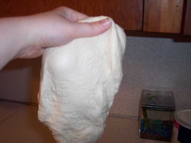 2. agarra la masa y estirarla en el aire. Utilice gravedad para estirar la masa. Tratar de que la masa cerca del tamaño que usted necesite. Probablemente usted comenzará a obtener algunas partes más delgadas - trate de no estirar cualquier parte que puede ver luz a través de ya ya que es posible que un agujero.
