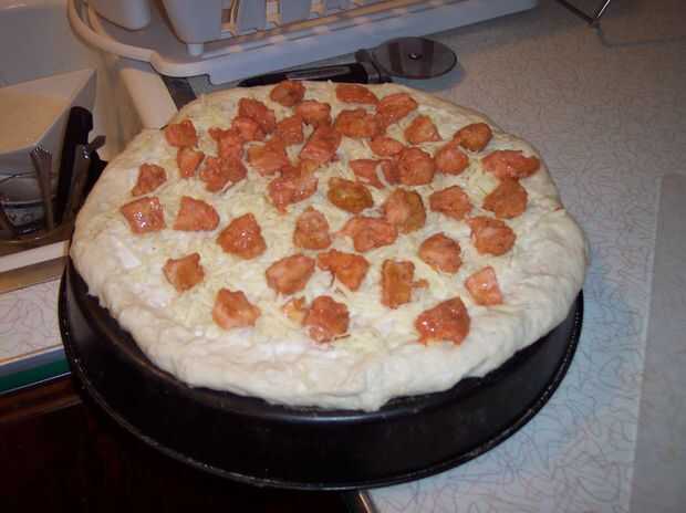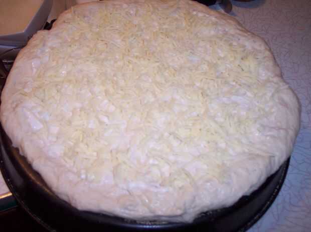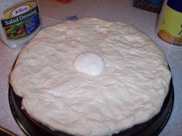 5. Espolvoree alrededor de 1 taza de mozzarella encima del queso de bleu. Que te desea extender uniformemente. Se debe ver algún queso de bleu a través de los espacios de la mozzarella. Asegúrese de que ir todos de la forma de la bordes/corteza.