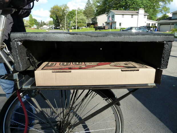 Mi moto está equipada con un bastidor trasero, por lo que se utilizo para el portador de la pizza.