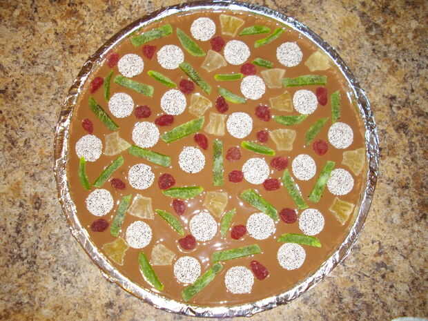 Agregar estos dos ingredientes a la pizza.  Puede que desee planear donde va a colocar los elementos restantes, ya que las piezas necesitan tocar el chocolate de leche derretido (piense de él como el 'pegamento' que mantiene la pizza juntos).  Dejar espacio para la papaya y nueces!