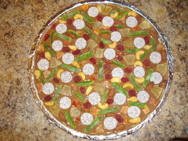 Ahora es el momento de añadir los trozos de papaya deshidratada y las tuercas.  Tratar de difundir hacia fuera, y mezclar con todo lo demás sobre la pizza.  Estos son los dos últimos ingredientes que necesitan tocar el chocolate de leche derretido así poner dondequiera que usted puede!