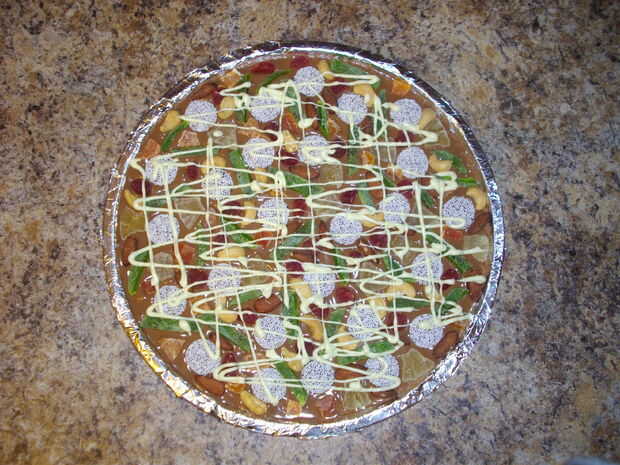 Una vez fundido, moviendo su brazo con un movimiento de lado a lado, apretar suavemente la botella invertida para que el chocolate blanco, que parece de queso fundido, hace un bonito patrón en la parte superior de la pizza. Parar y girar la pizza 90 grados. Repita el movimiento de lado a lado, apretando el blanco derretido chocolate sobre la pizza.