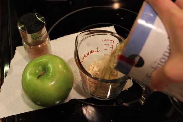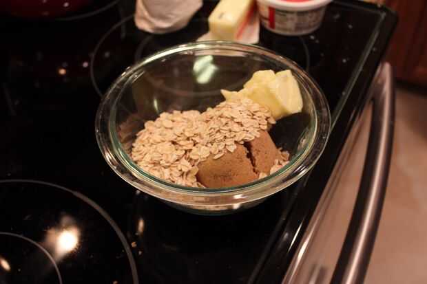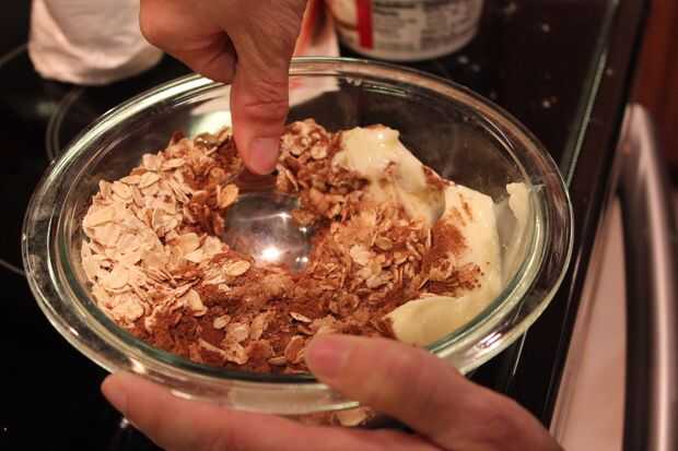 Coge un recipiente de tamaño pequeño o mediano. Combine la mantequilla, el azúcar, la avena y la canela hasta incorporar bien. Usted no necesita una licuadora para esto, sólo tiene que utilizar una cuchara de buena o incluso las manos.