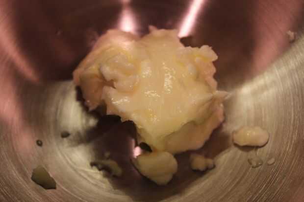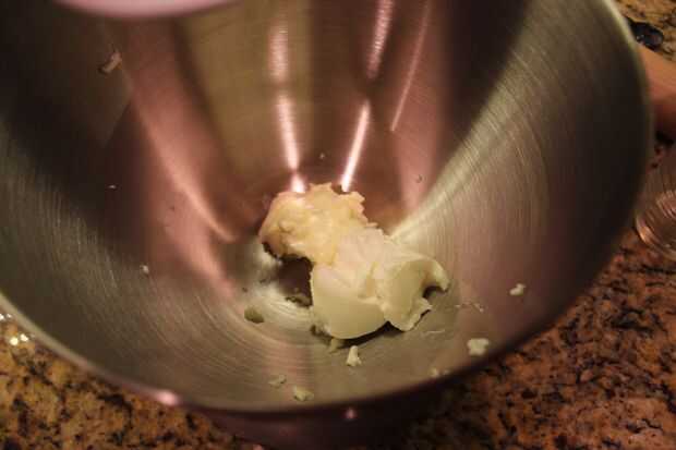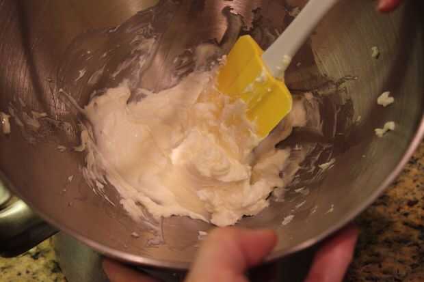 Bata la mantequilla reblandecida sin sal y crema de queso a una velocidad media de cerca de 1 minuto. Raspe los lados para asegurarse de que todo está incorporado.