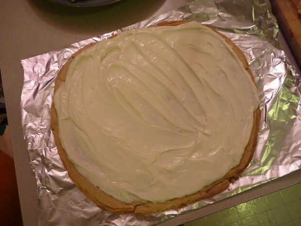 Extender el glaseado uniformemente sobre la costra de galleta de azúcar.  Asegúrese de que usted obtener en todas partes - va a ser el pegamento que mantiene unida a toda la operación.