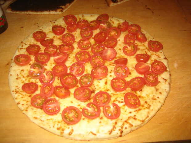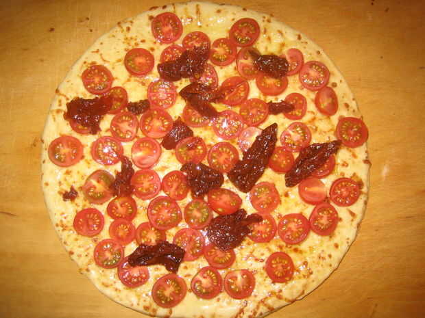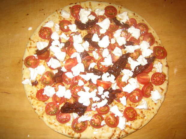 Extender la salsa uniformemente sobre la corteza. Añadir los tomates. En esta versión, fui un poco pesado sobre los tomates y utiliza la pinta toda, pero normalmente utilizo solamente cerca de 1/2 de una pinta. Agregue algunos tomates secada al sol. Añadir 2-3 onzas de queso de cabra o como quieras. Poner en el horno durante unos 15 minutos o hasta que el queso de cabra empiece a dorarse un poco.
