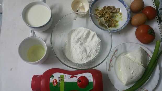 Estoy usando para el plato 1 taza de harina, 2 huevos, sal, 2 tomates, salsa de tomate, aceite, media taza de leche, queso, pollo cocido, cebolla de verdeo