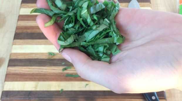 Por último, chiffonade la albahaca. Este instructable tiene gran instrucciones sobre cómo hacerlo. Básicamente usted coloque las hojas de albahaca cada uno encima del otro, hacerlas rodar todo y arado a través de ellos con un cuchillo. Esto hace bien poco tiras de albahaca!