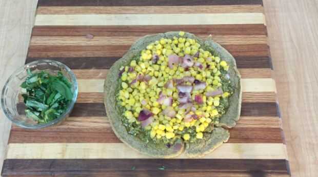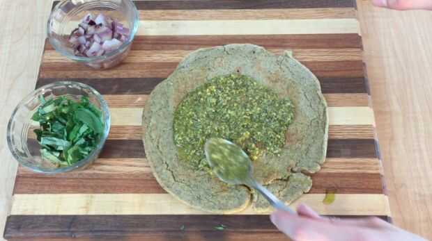 Extender una capa de pesto sobre la corteza de quinua.