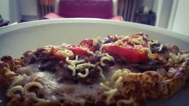 Como hacer ramen, pizzaPaso 1: Hervir el agua para 3 ~ 4 minutosPaso 2: Cuando el agua comience a hervir pone los fideos ramen en élPaso 3: Calentar la sartén antiadherente a fuego medio y añadir algún aceite vegetal. Colocar los tallarines secados e