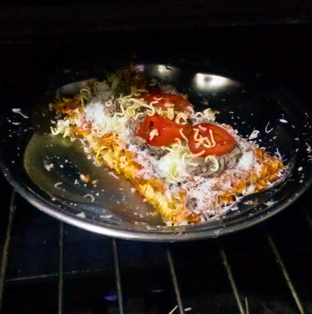 Recargar con cualquier cosa que usted prefiere. Pimiento, salami, salchicha, champiñones, más queso... Lo que usted como o en mi caso, lo que está ahí. Cuando termines con eso, pop en el horno. Depende de su preferencia y su horno, pero no tarda más de 10 minutos. Mantener un control sobre él. Ser casi listo cuando el queso se derrita completamente.