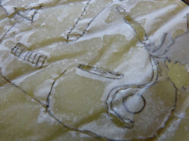 empezar a cortar las líneas con un cuchillo, bisturí o sharp - el papel no es tan fácil de cortar, pero lo suficiente si traza las líneas, por lo que mostrará en el queso al retirar el papel.