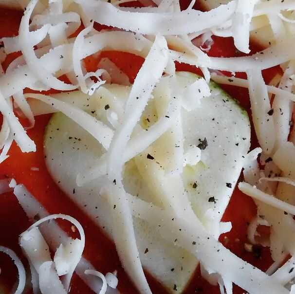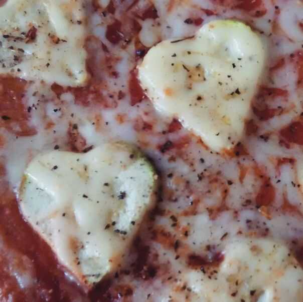 Esto tiene que ser la pizza más básica que he hecho, cada sábado por la noche es noche de pizza en nuestra familia. Toppings consisten en generalmente un montón de verduras, carne y a veces alcaparras o jamón serrano y hojas de rúcula. Las variaciones son infinitas... Ya que esta es una receta sencilla que los niños pueden fácilmente involucrarse. Usé un corazón con forma de cortador de galletas para cortar calabacines de corazón. El relleno era literalmente 3 ingredientes básicos, passata de base, queso cheddar y calabacín.
