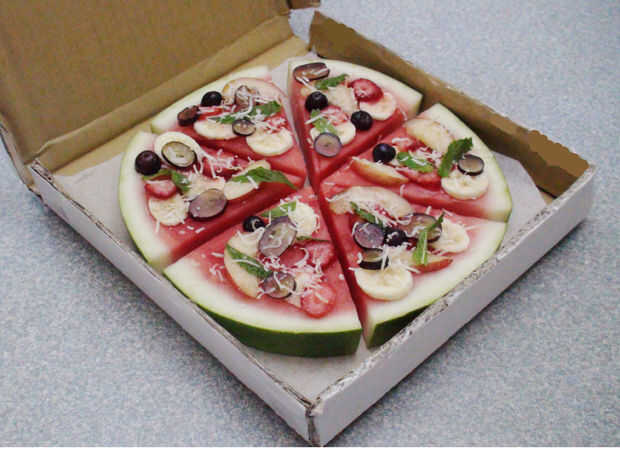 ¿Por qué no poner una vuelta de tuerca sobre el viejo plato de fruta y vestirse como una pizza?Al comer la sandía un día de verano, me di cuenta de una rebanada no miró demasiado lejos de un bollo de pizza cubierto de salsa de tomate - y así fue como
