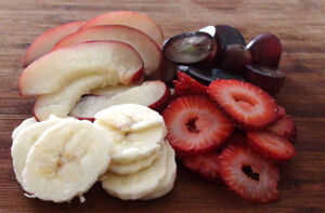 Tomar su fruta que han recogido para ir encima de la Base y rebanada a lo que se ve bien en tu Pizza. Cortar la banana y fresas en rodajas, las uvas en medio de cualquier manera (ambos se veía bien) y la nectarina blanca en finos gajos.