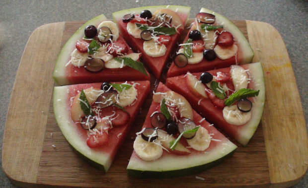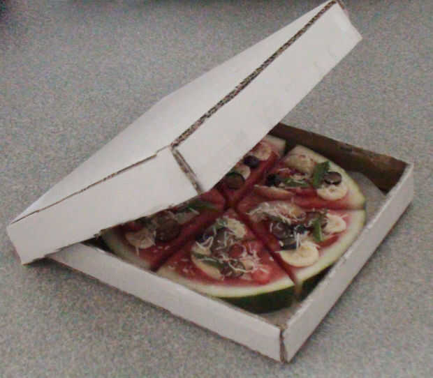 ¿Por qué no poner una vuelta de tuerca sobre el viejo plato de fruta y vestirse como una pizza?Al comer la sandía un día de verano, me di cuenta de una rebanada no miró demasiado lejos de un bollo de pizza cubierto de salsa de tomate - y así fue como