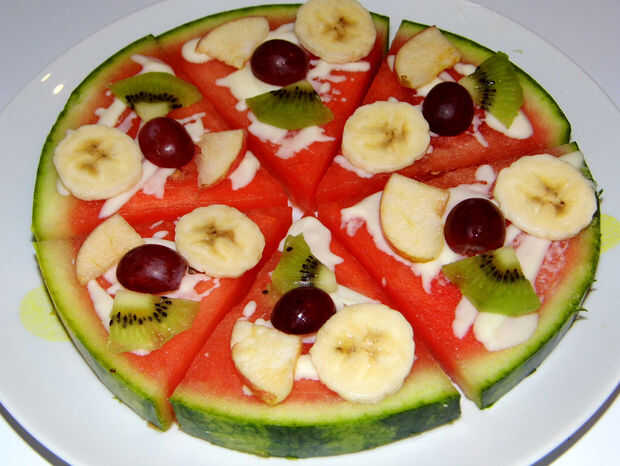 ¿Por qué no poner una vuelta de tuerca sobre el viejo plato de fruta y vestirse como una pizza?Al comer la sandía un día de verano, me di cuenta de una rebanada no miró demasiado lejos de un bollo de pizza cubierto de salsa de tomate - y así fue como