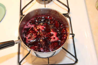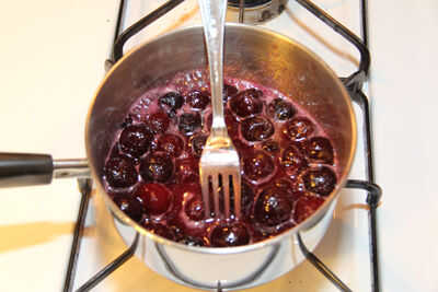 Lanzar todo pero 6 grandes cerezas en una cacerola y calentar hasta que comience a espesar. Puede romper las cerezas con un tenedor mientras están cocinando.