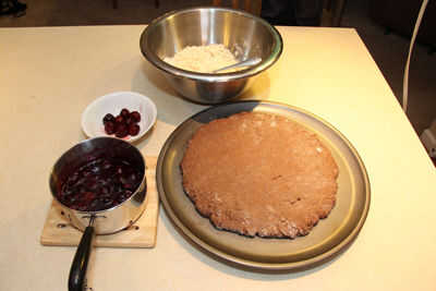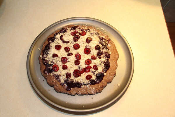 Si ha guardado 6 cerezas puede cortarlas y colocar en la miga como toppings. O utilizar otras bayas.