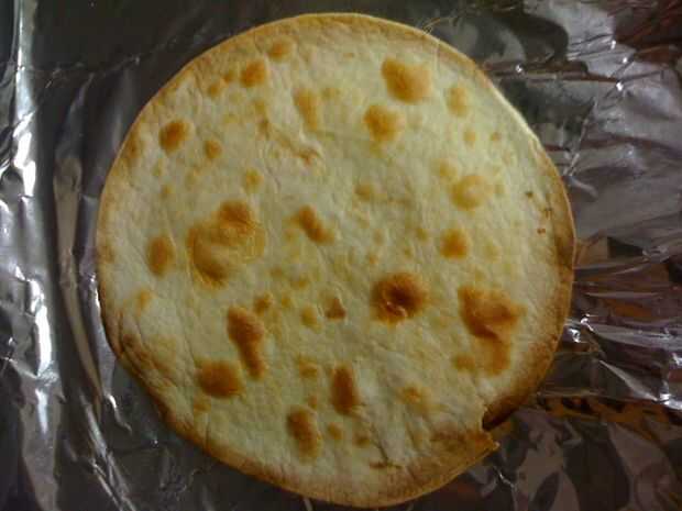 Spray o pincel de aceite de oliva en un lado de su tortilla(s) lugar el lado aceitado boca arriba en la hoja de galleta alineada. Lugar en la parrilla hasta que apenas doren (esto será muy rápido así que mantener un ojo hacia fuera). Voltear la tortilla y repita a partir del aceite de oliva. Una vez que ambos lados estén dorados, retire el tortilla(s) y apague el asador. Calentar el horno a 425 grados.