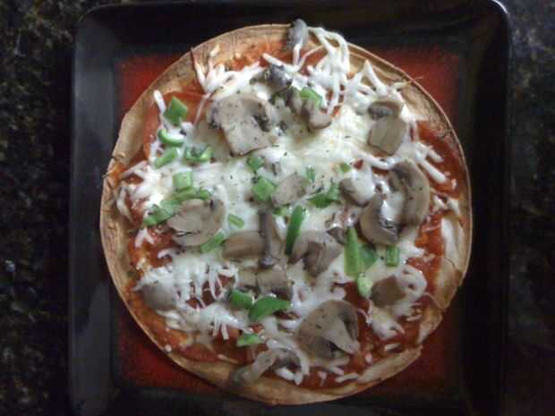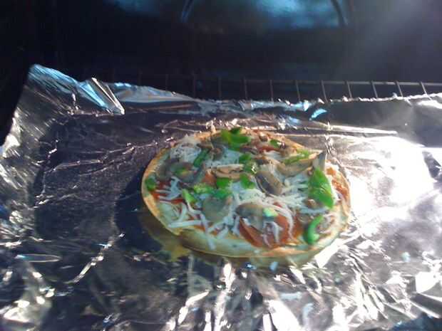 Extensión siguiente salsa para espagueti sobre tortilla, tanto como te gusta. Añada sus ingredientes--mina pepperoni de pavo, luego queso mozzarella, luego verduras y terminado con la albahaca. Vuelva a colocar en el horno hasta que queso fundido (apx. 5 minutos).