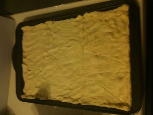 En primer lugar, vamos a hacer los rollos de media luna. Precalentar el horno a 375, o como el paquete dirige. Usted tendrá que extienda los rollos de media luna y asegúrese que estén conectados. Si tienes más pasta, a romper todo. Hice una corteza ligeramente levantada por pellizcos hasta los bordes. Puede utilizar los dedos para hacer todo esto. A sellar todos los agujeros.