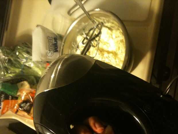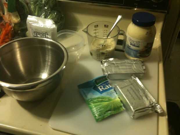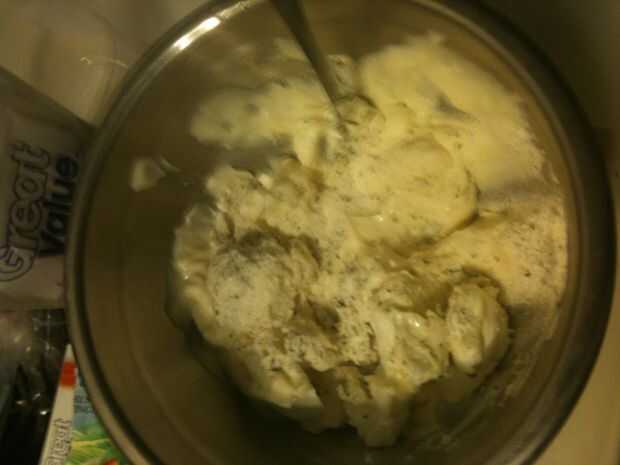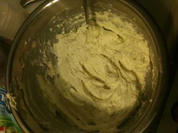 En el tazón grande, poner los 2 paquetes de queso crema, 1 taza de mayo y todo el paquete de mezcla de Rancho. No tengo queso crema ablandado por lo que fue difícil hacer puré para arriba. Sacó el mezclador y había mezclado en bajo durante 2 minutos. Todavía puede tener algunos tumores en ella, sólo intentar conseguirlo todos mezclados.