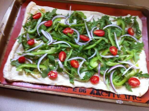 este es un pastel en forma de Pizza con verduras y pan de PitaCueza al horno y disfruta!!!Paso 1: Ingeredients Necesitas estos:Pan de PITApasta de tomatemantequillaajoRomeropimientapolvo de la paprikacebolla, picadachampiñones, picadosPimentones Rojo