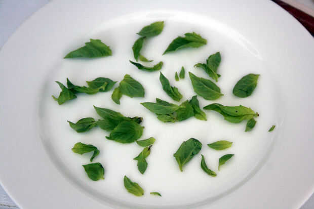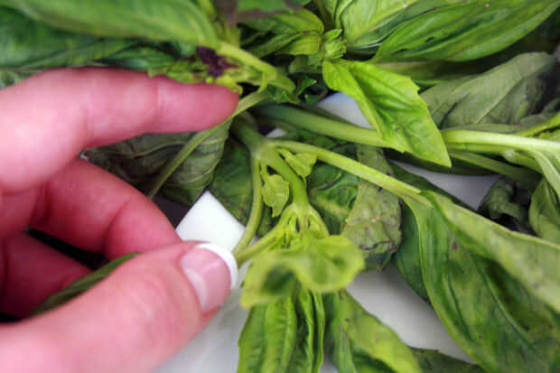 Buscar las hojas más pequeñas de albahaca cerca de la mitad de sus tallos.  Elige los que nunca tuvieron la oportunidad de alcanzar su pleno potencial y que la estrella del show!