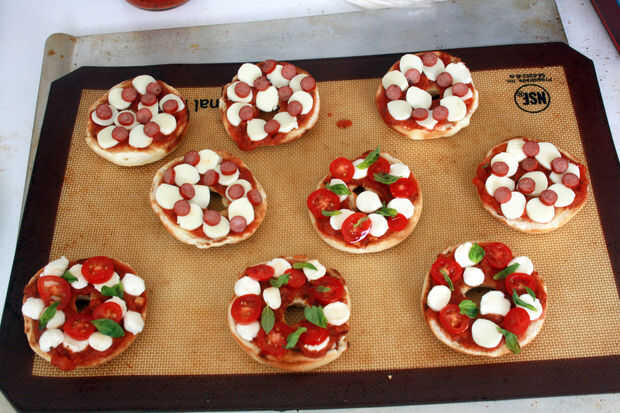 A partir de salsa, montar los ingredientes como parezca.   Un poco de tiempo y cuidado asegurará de las pizzas más lindos posible.