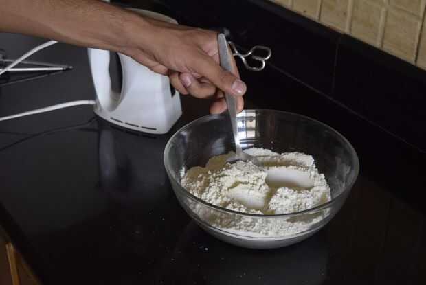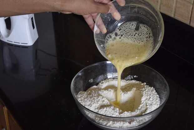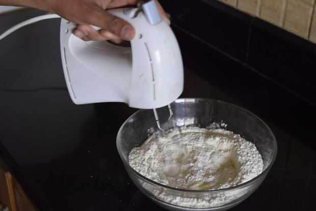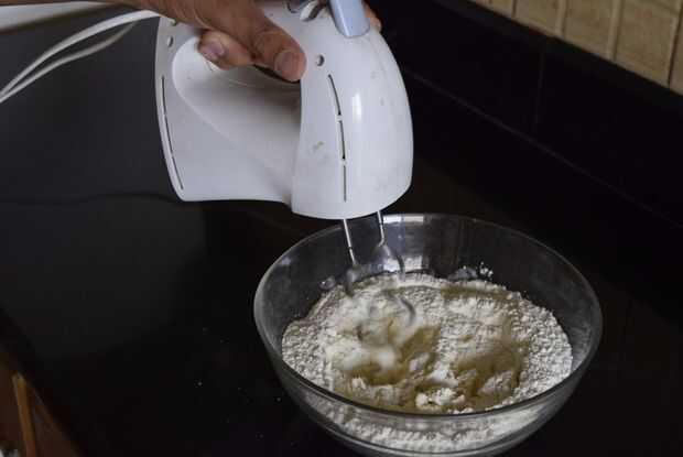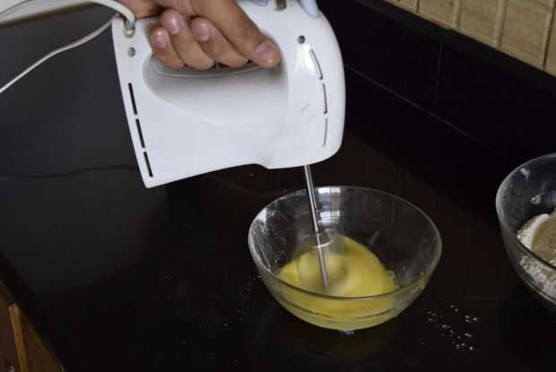 Batir los huevos en un recipiente aparte y añadir en el intestino principal. Utilizando masa mezcla accesorios comienzan a mezclar la masa con la batidora eléctrica o espátula.