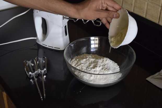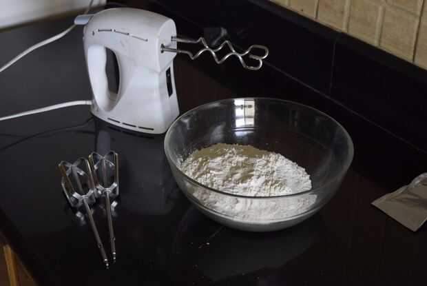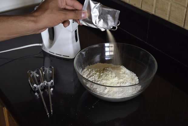 Añadir los ingredientes secos juntos en un intestino grueso. Ahora he usado un batidor eléctrico para todo el proceso pero lo puedes hacer sin él así. Mezcle el contenido seco, incluyendo harina, leche en polvo y levadura instantánea. Mezclar con una cuchara grande
