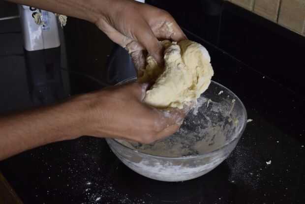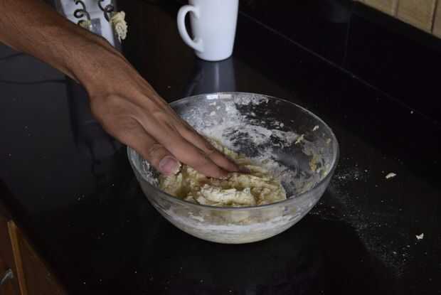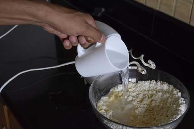 Agregar el agua tibia. Tiene que estar caliente al tacto. No caliente para matar la levadura y no al frío para no activarlo. Batir más hasta que la pasta empiece a formar y el batidor se ralentiza.