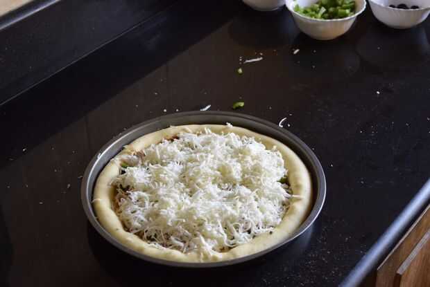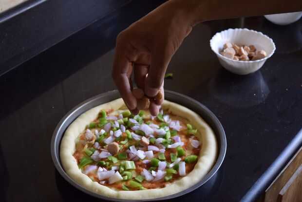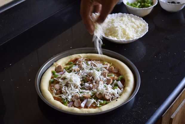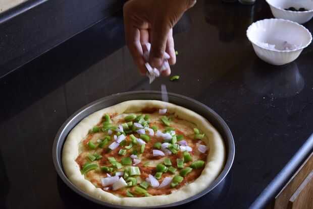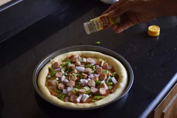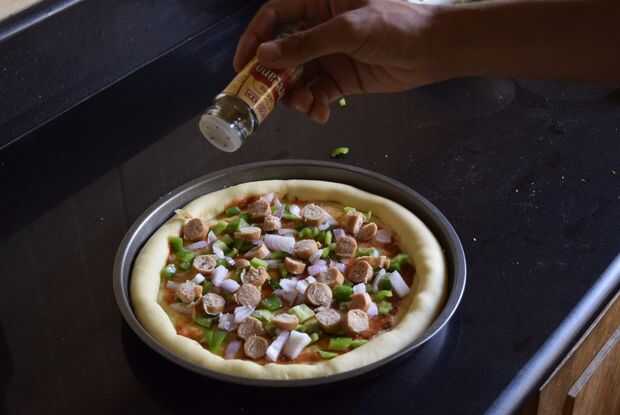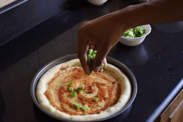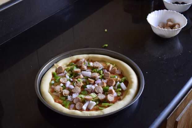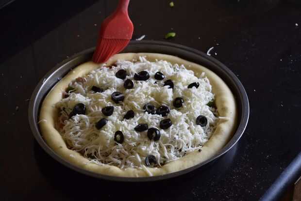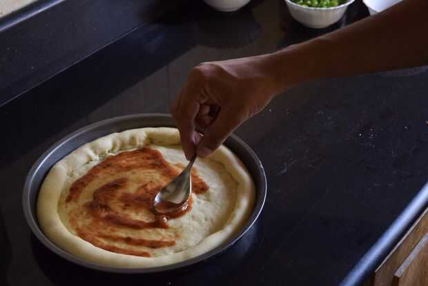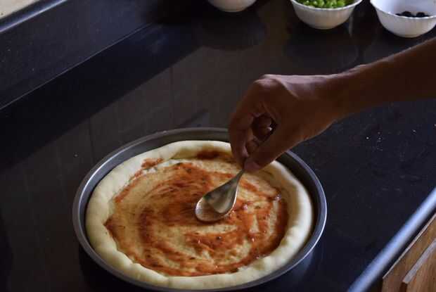 Salsa de pizza se aplican a la base, pero no demasiado o bien su pizza será muy delicuescentes.