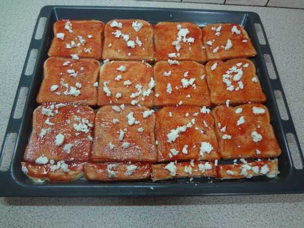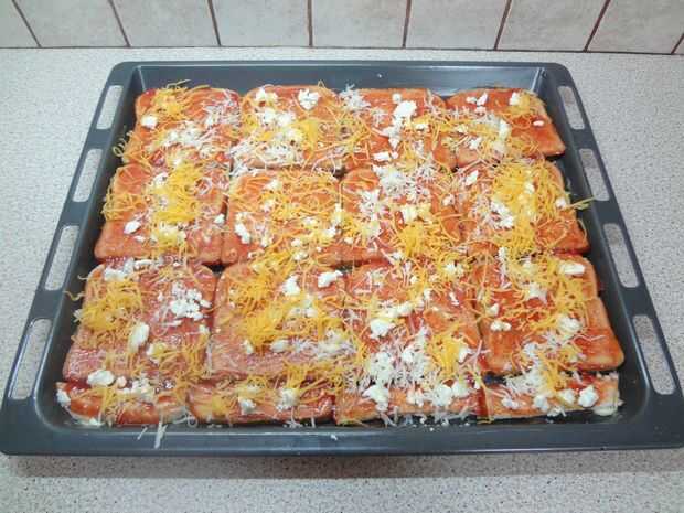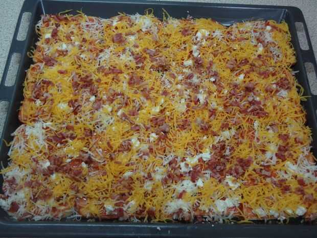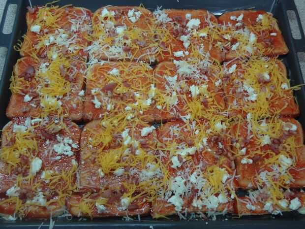 Difundir los quesos y el tocino en capas. En la parte inferior colocar el queso feta ya que cuando se funda crea una salsa cremosa.