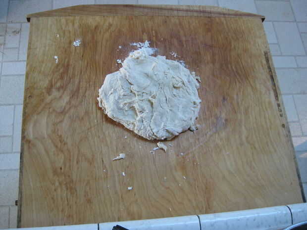 todo el agua y constantemente añadir dos tazas más de harina que se mezcla. Realmente ayuda a tener una consola mezcladora automática, pero hacerlo a mano funciona igual de bien. Volcar la pelota increíblemente pegajosa de la masa sobre una tabla de cortar u otra superficie portable (es
