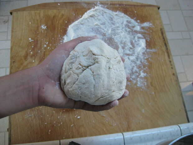 mucho más fácil de lavar) que usted ha espolvoreado ligeramente con harina. Cubrir las manos en una capa fina de harina (la harina evita que se pegue) y amasar. Tienes que añadir la última taza de harina que usted está amasando la masa porque eso hará que