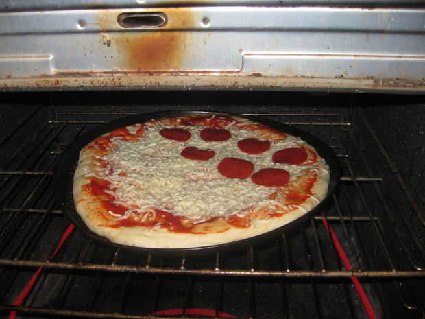 Pizza cruda es casi lo único en el mundo peor pizza fría. Una vez que el horno alcanza los 450 grados (Fahrenheit) cocinar la pizza durante unos diez minutos. Puede tomar un poco más o menos que eso, así que a los diez minutos stick un cuchillo en el centro de la pizza. Si es aún pastoso, le dan un par minutos.