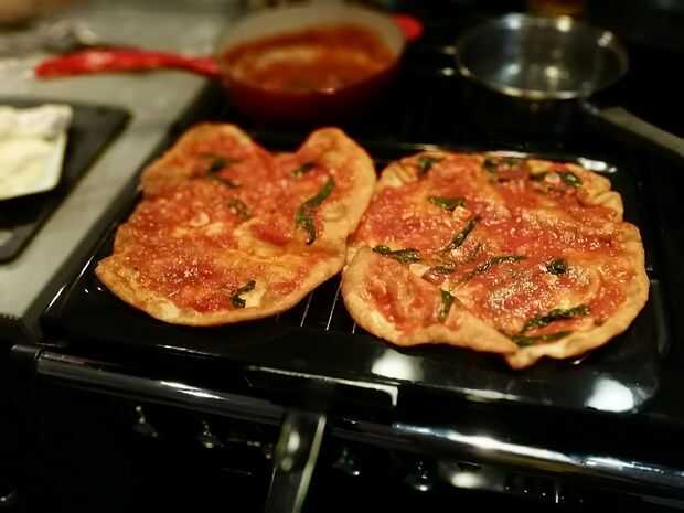 Con una cuchara extendió una sexta parte de la salsa de tomate por la base y luego añadir ingredientes. Generalmente comienzan con lonchas de mozzarella y añadir el resto a 1 o 2 sabores principales por pizza. Menos es más cuando tienes buenos productos!