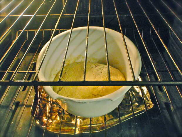 3. ruede la bola de masa en el recipiente engrasado y colocar en el horno (sin calefacción) a la altura (sobre una hora y media)