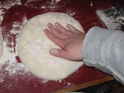2. una bola de masa de harina y ponerlo sobre una superficie enharinada con un pequeño espacio para trabajar con. Aplanar la masa con los dedos, tratando de dejar un poco en el borde de una corteza. Trate de empujar desde el centro a los bordes, todo. Cada tan a menudo, la parte superior de la harina, raspar el borde, dale la vuelta, harina más y seguir estirando.