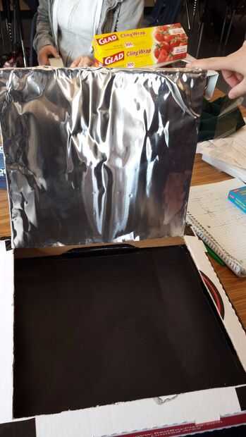 Hornos solares utilizan los rayos uv del sol para calentar el objeto. Esto ocurre porque los rayos UV se reflejan del aluminio y en la caja. En el cuadro tenemos papel negro para absorber creando calor, papel negro es el mejor para la absorción de ca